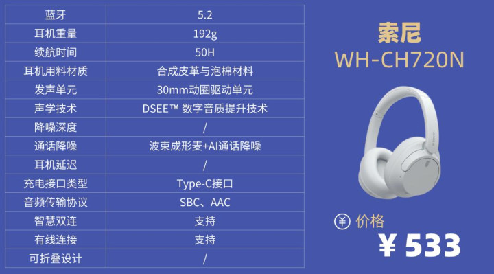学生党头戴降噪耳机排行榜10强机型10:索 尼WH-CH720N头戴式降噪耳机