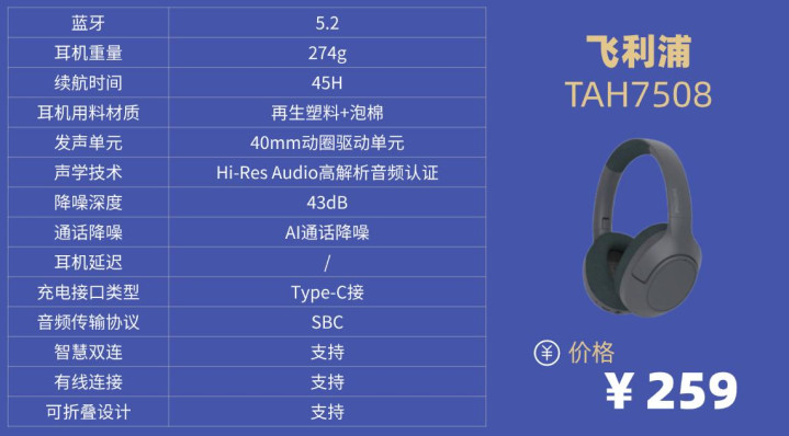 学生党头戴降噪耳机排行榜10强机型9:飞 利 浦TAH7508头戴式降噪耳机