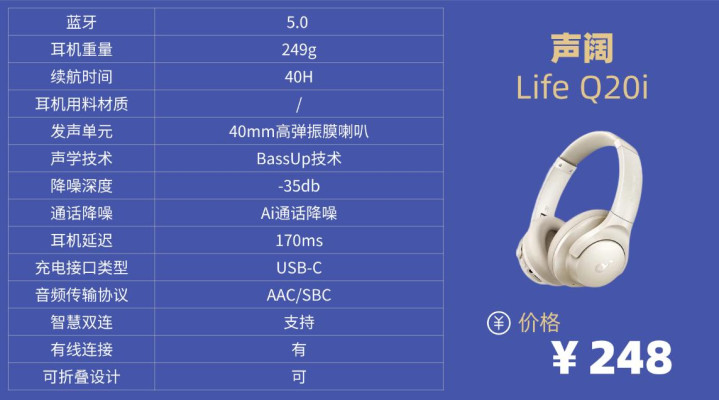 学生党头戴降噪耳机排行榜10强机型5:声 阔Life Q20i头戴式降噪耳机