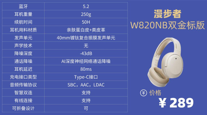 学生党头戴降噪耳机排行榜10强机型2:漫 步 者W820NB双金标版头戴式降噪耳机