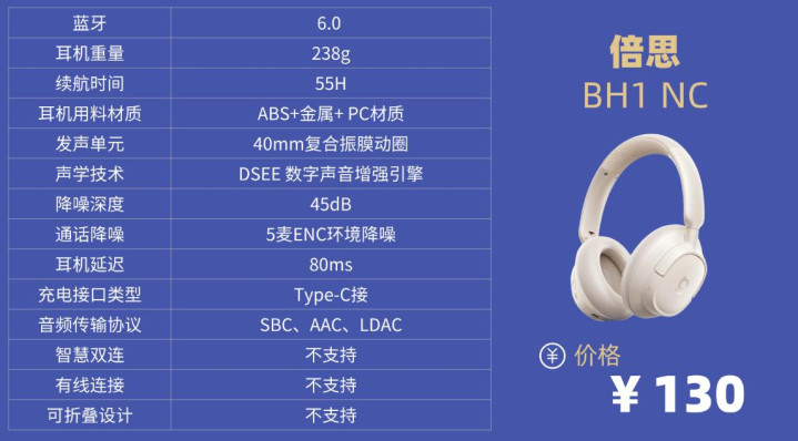 学生党头戴降噪耳机排行榜10强机型4:倍 思B H1 NC头戴式降噪耳机