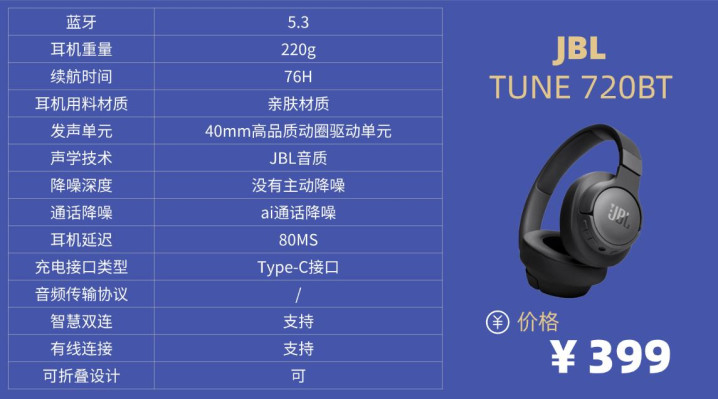 学生党头戴降噪耳机排行榜10强机型3:J BL T UNE 720BT头戴式降噪耳机